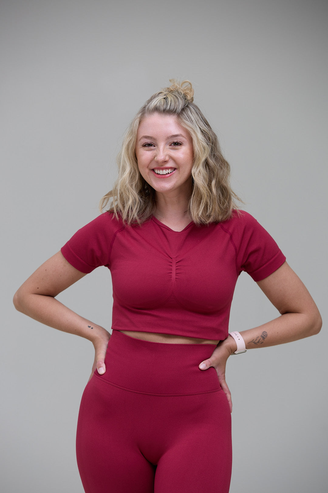 The Katy Set in wine red with sleek white side stripes creates a flattering silhouette...
