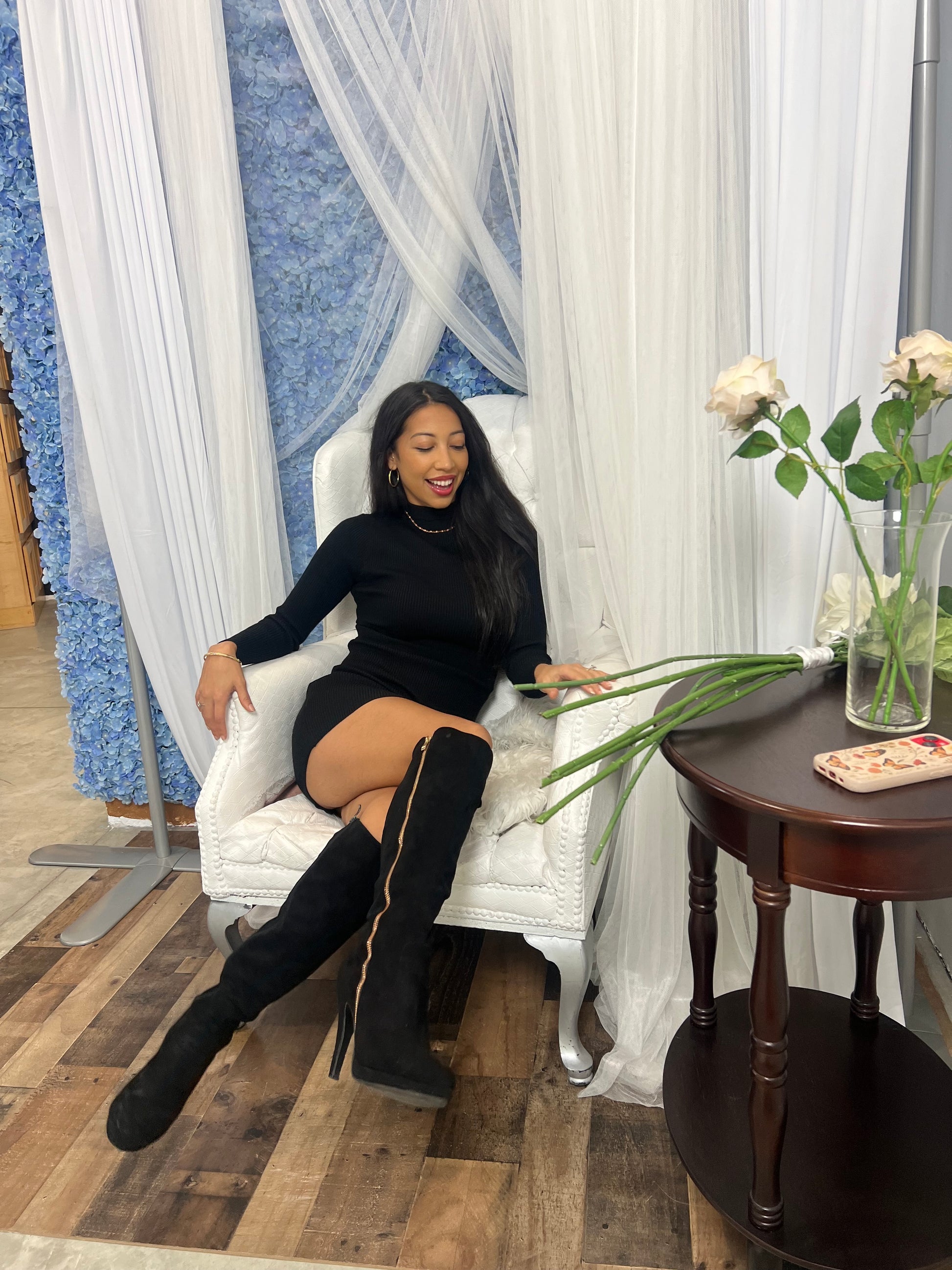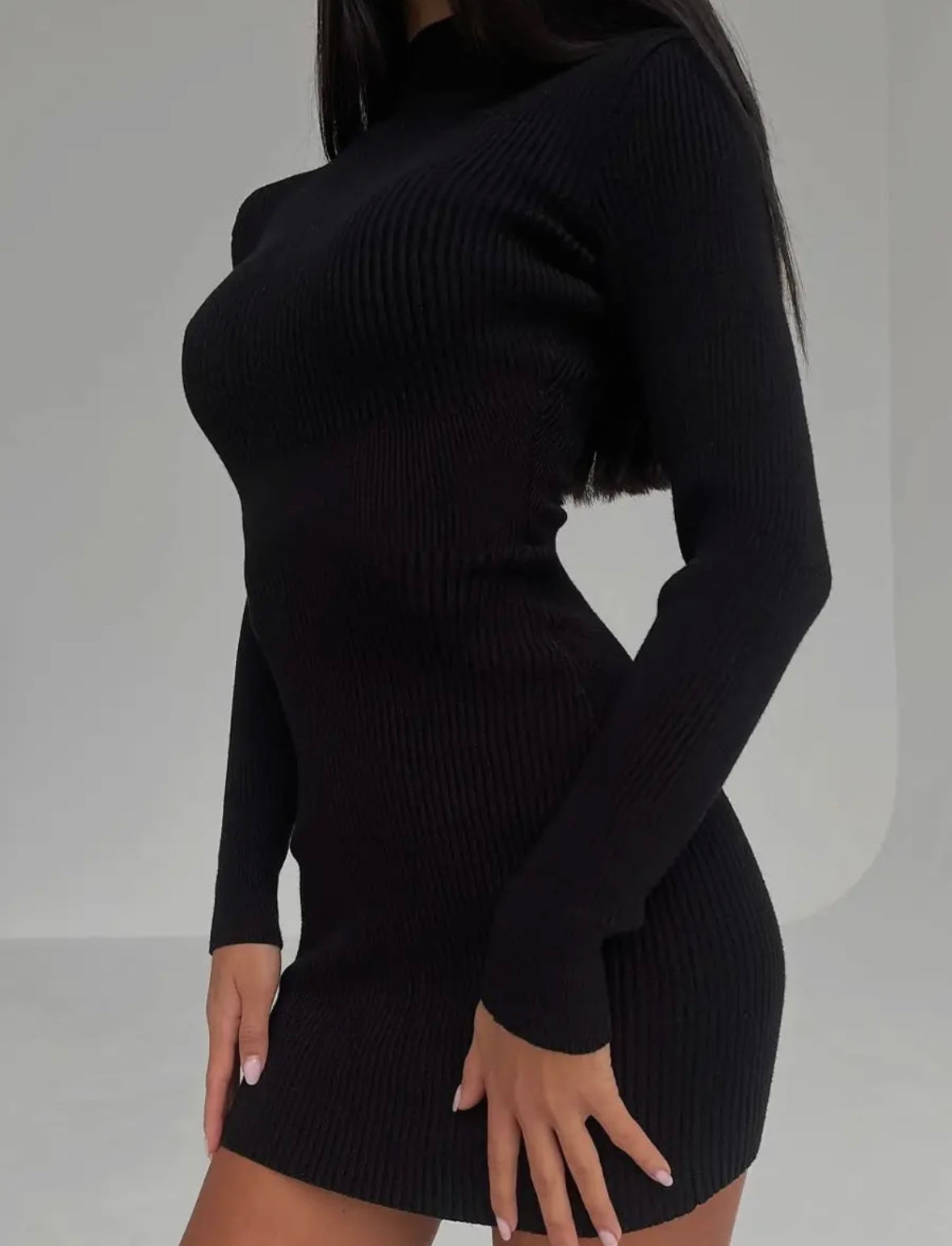Optimize your style with our Black Bodycon Dress, featuring a high neckline and a form-fitting silhouette. The elastic fabric ensures a comfortable yet chic look for any occasion.