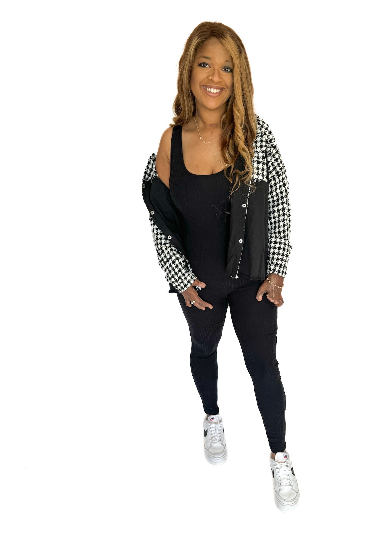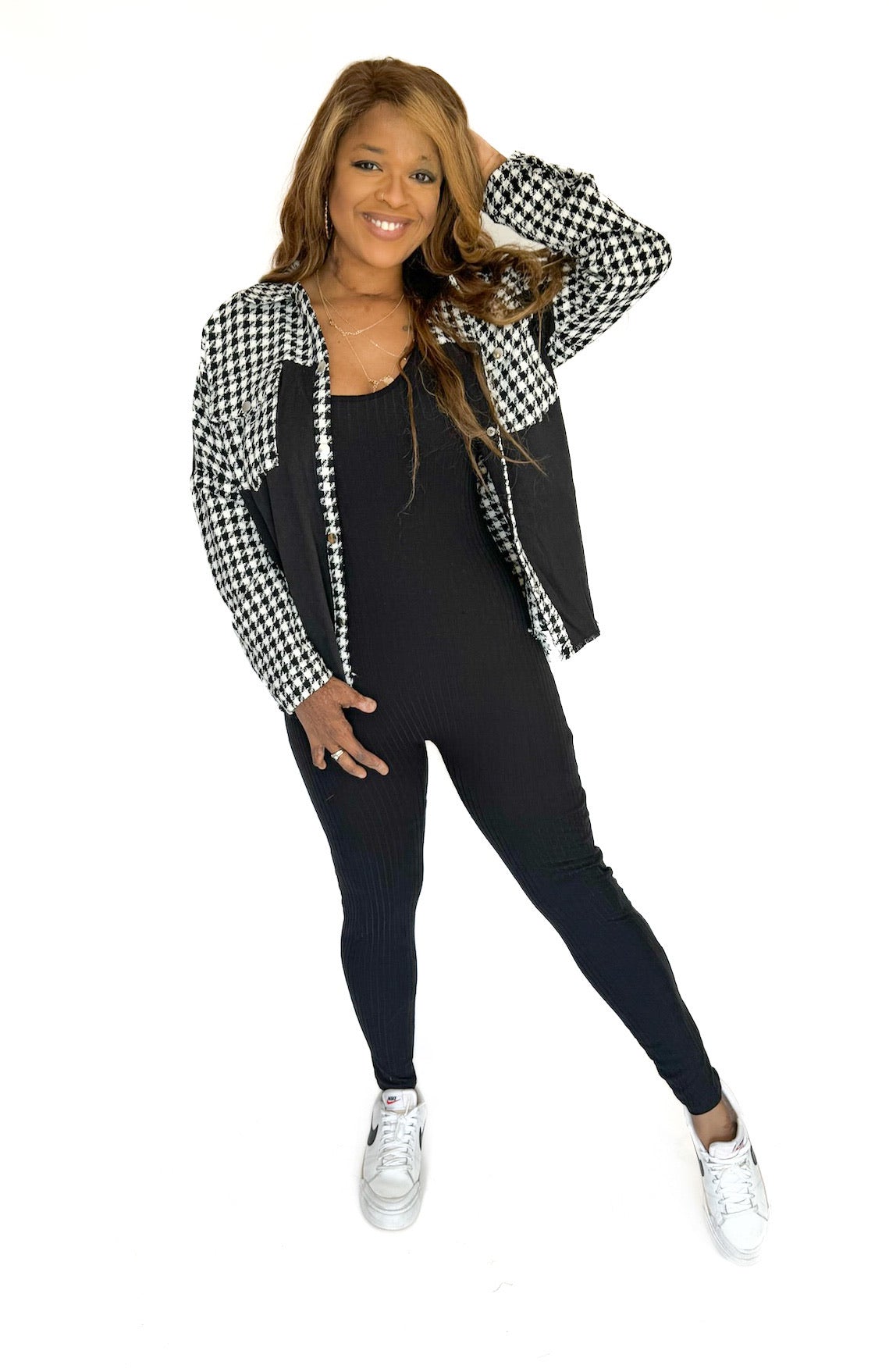 This black cat suit is flattering and stylish, perfect for any occasion. The lightweight fabric is comfortable and chic, and can be dressed up with a blazer or down with a jeans jacket. Available in full sizes.