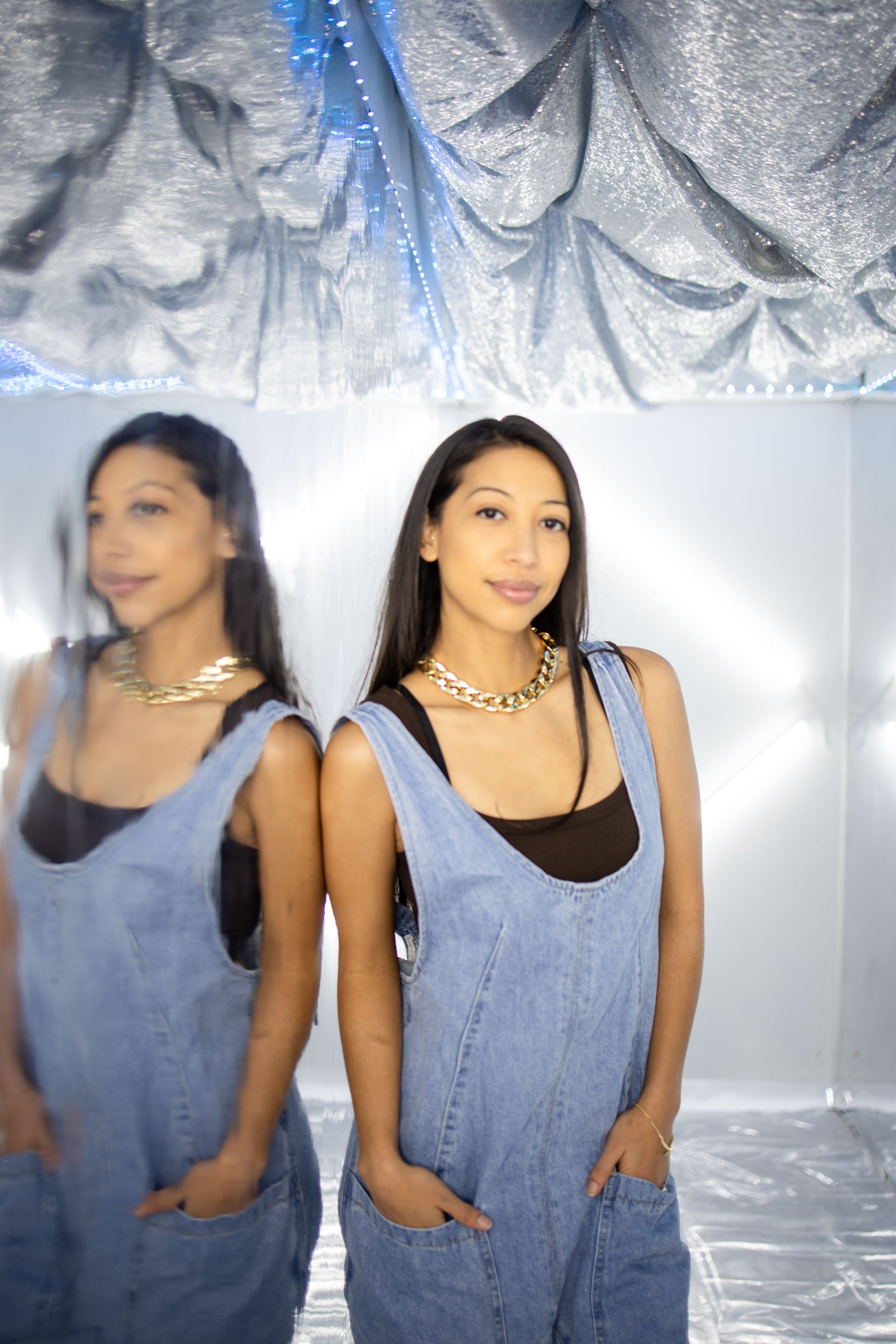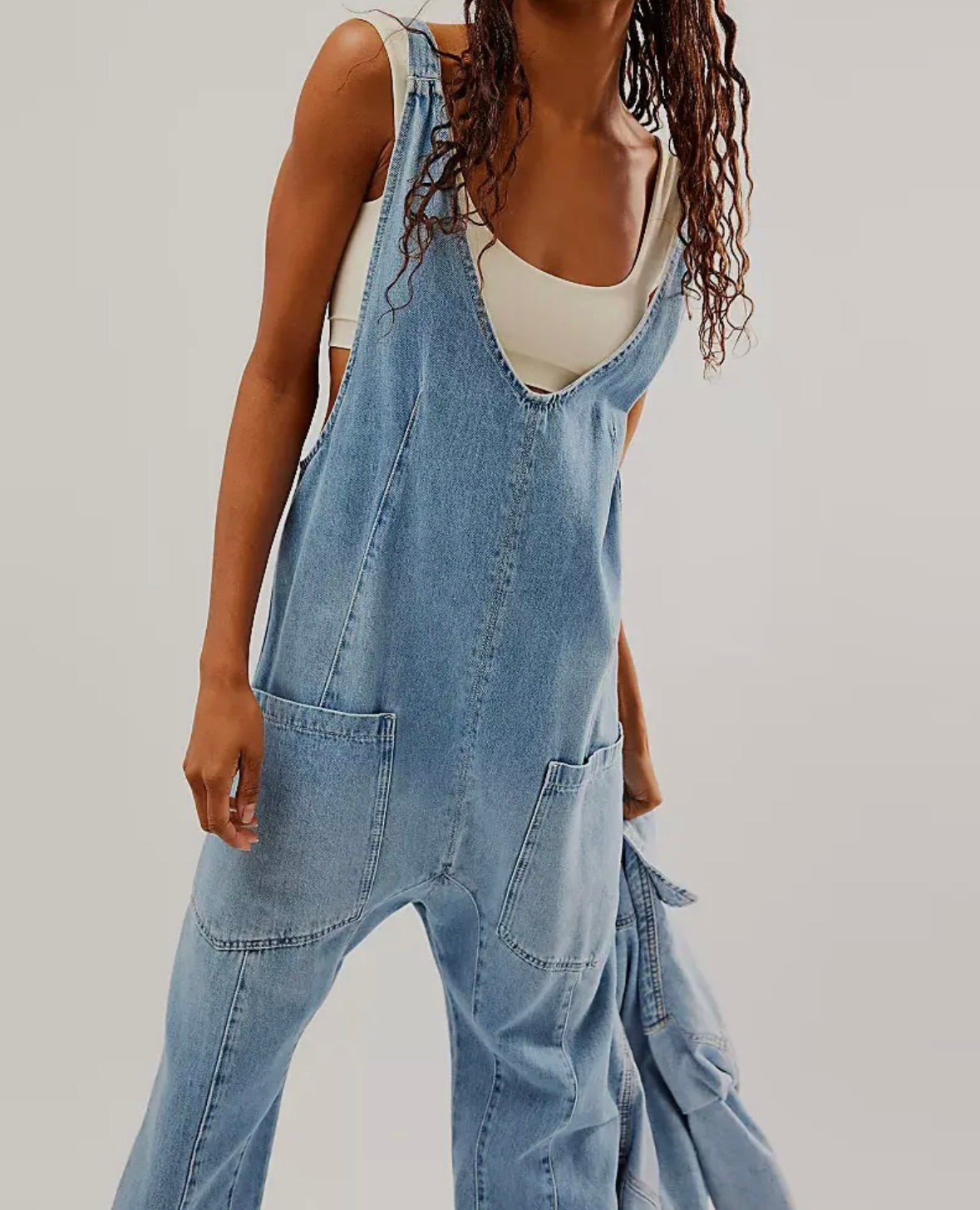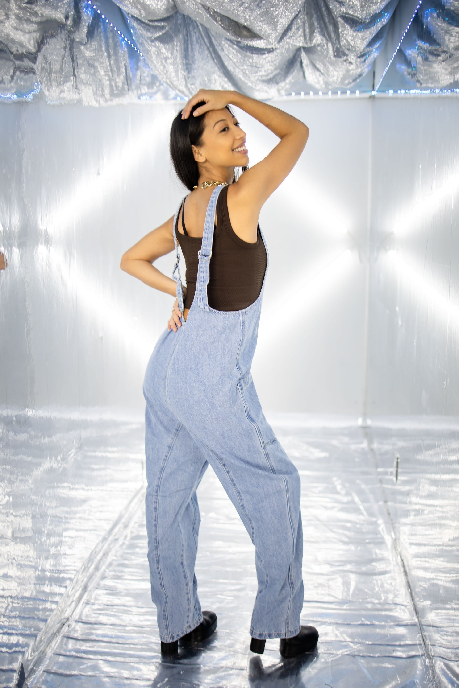 Elevate your style with the Denim Roller Jumpsuit, featuring adjustable shoulder straps for a customized fit. No need to take yourself too seriously, let your playful side shine with this quirky, high-flying outfit.