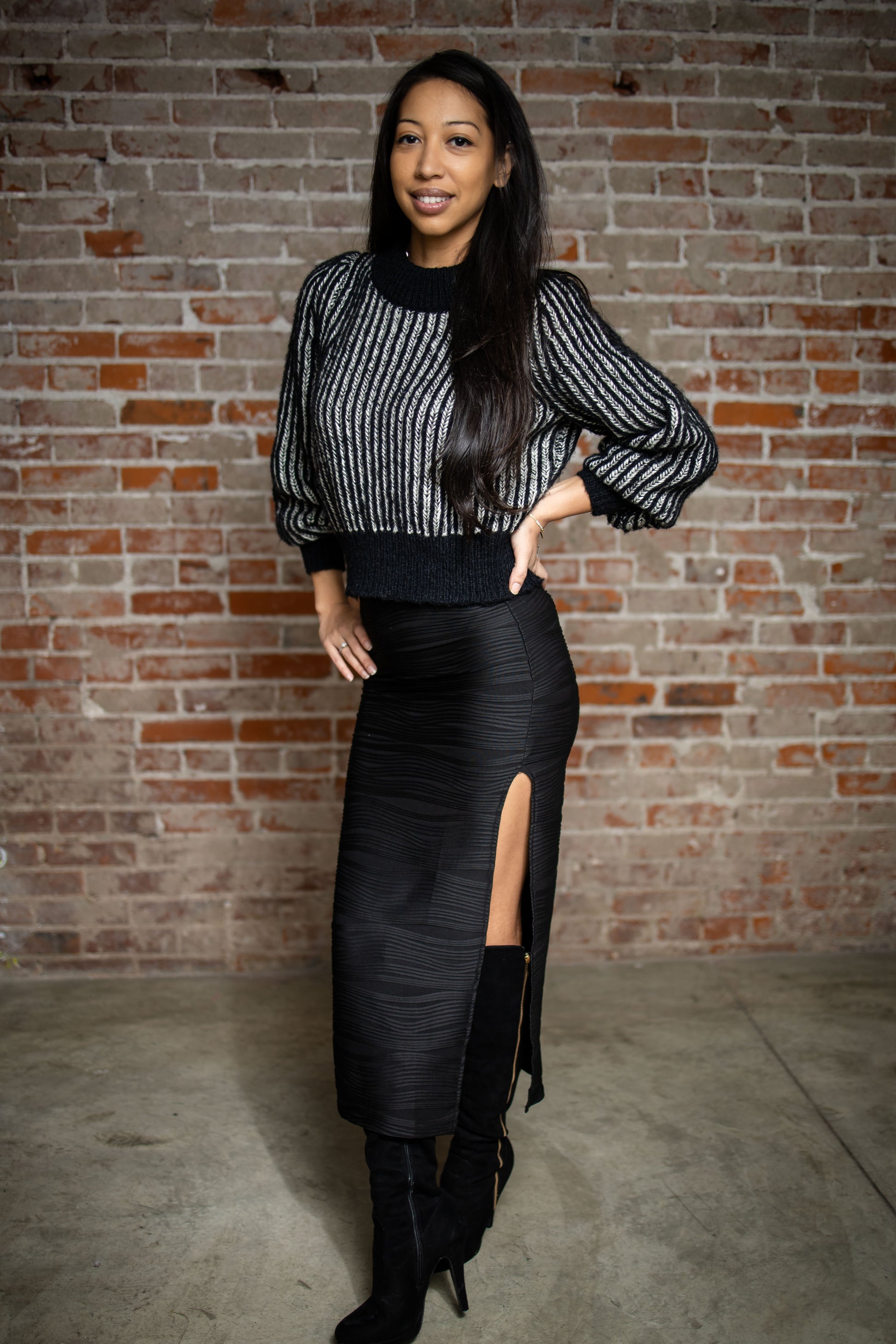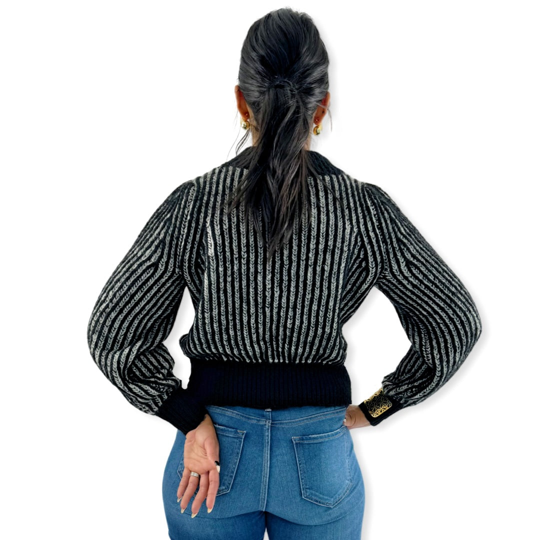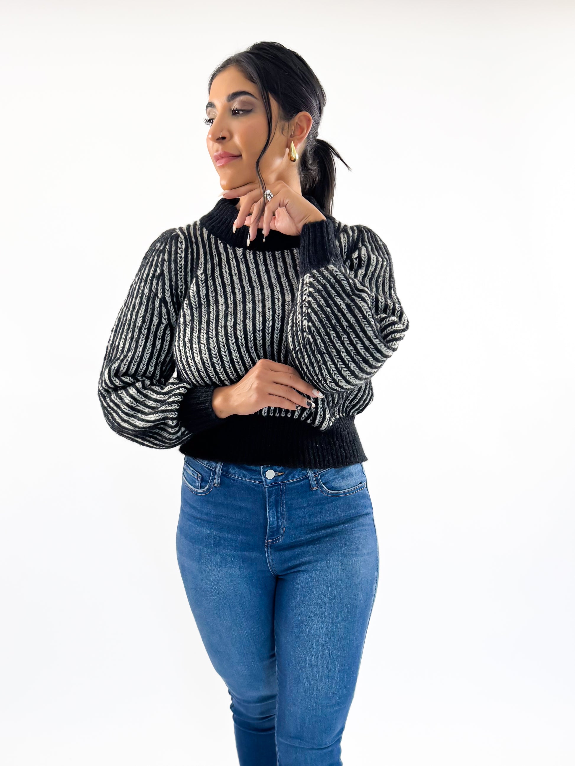 The Elysia Pullover offers a classic, elegant look that's perfect for any occasion. Crafted with a black and white design and puff sleeves, this piece is sure to become a staple in your wardrobe.