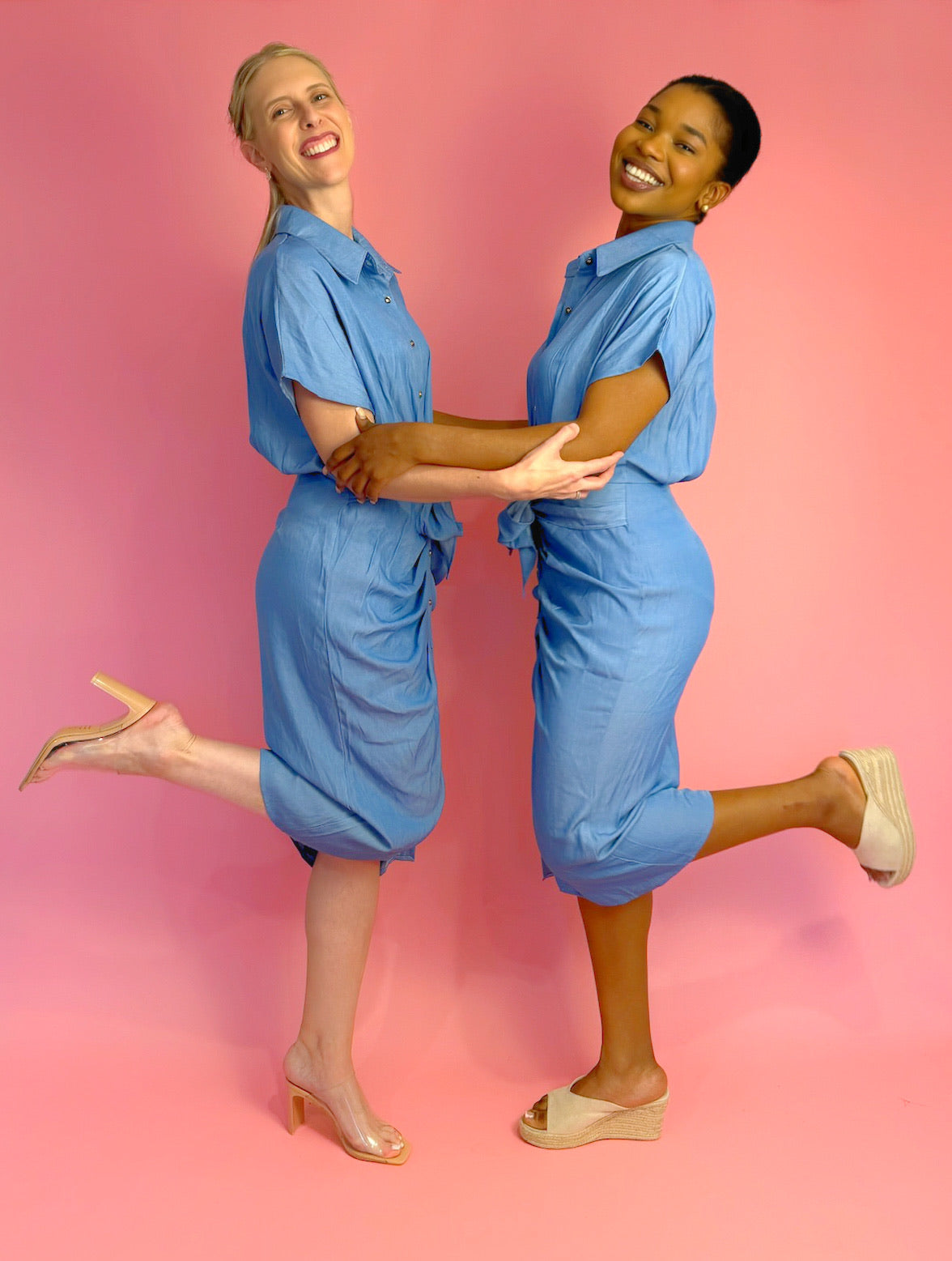 Effortlessly stylish, this blue denim optic dress is a must-have for any feminine wardrobe. Adorned with delicate strings to knot in the front, this versatile garment adds a touch of timeless elegance.