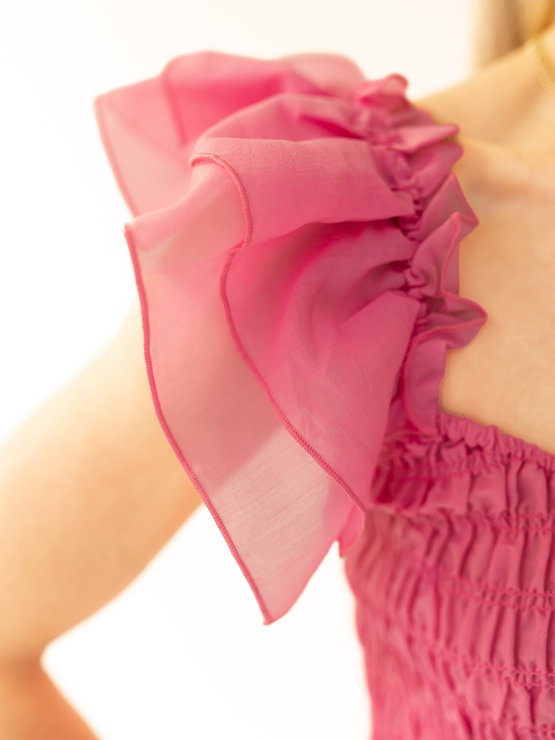 Be pink perfection in this shirred top with ruffled sleeves - a sweetly girly look that'll have 'em tickled pink!