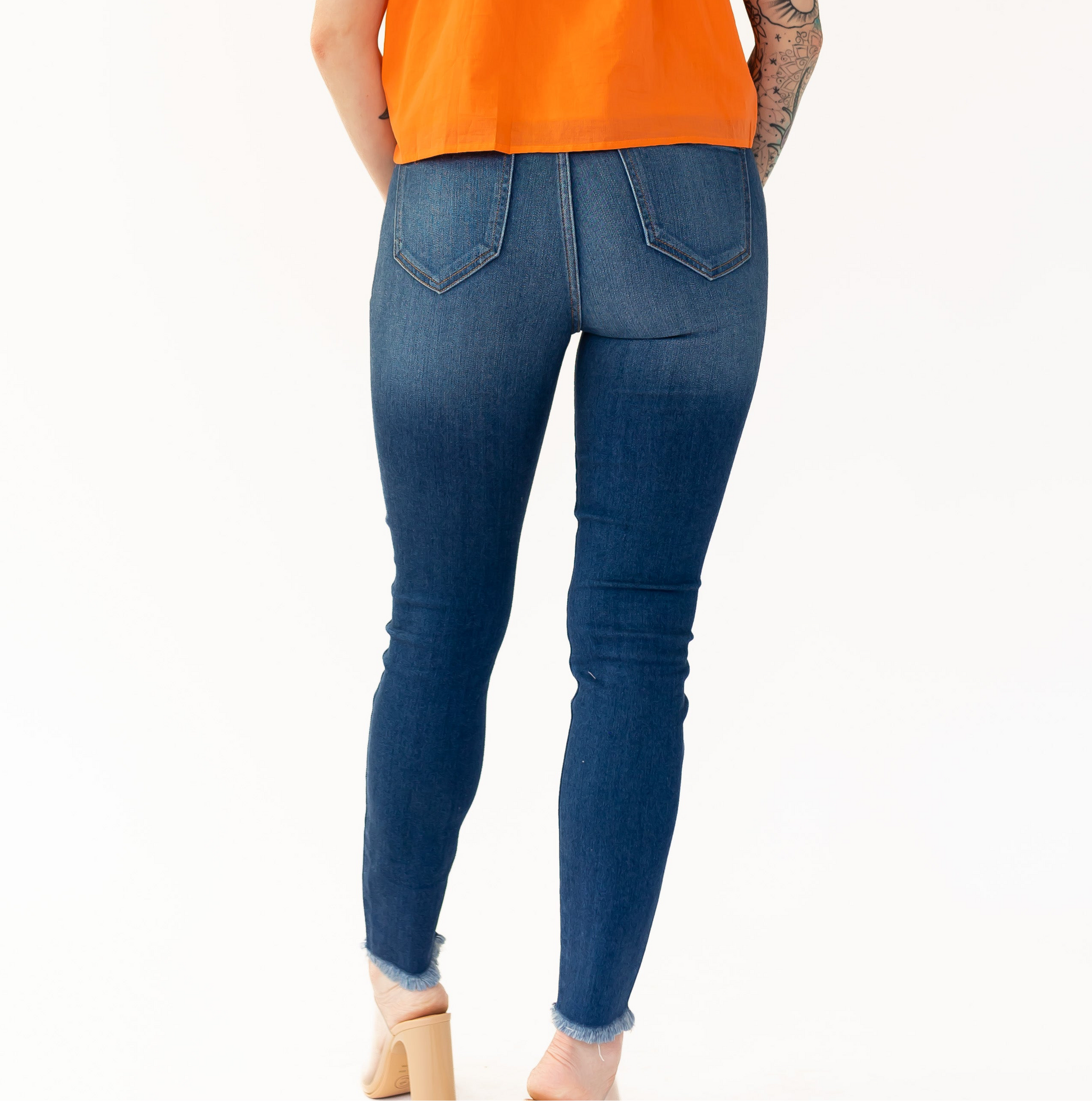 Let 'er rip with these elasticized, soft-rise, frayed-hem cropped jeans in blue!