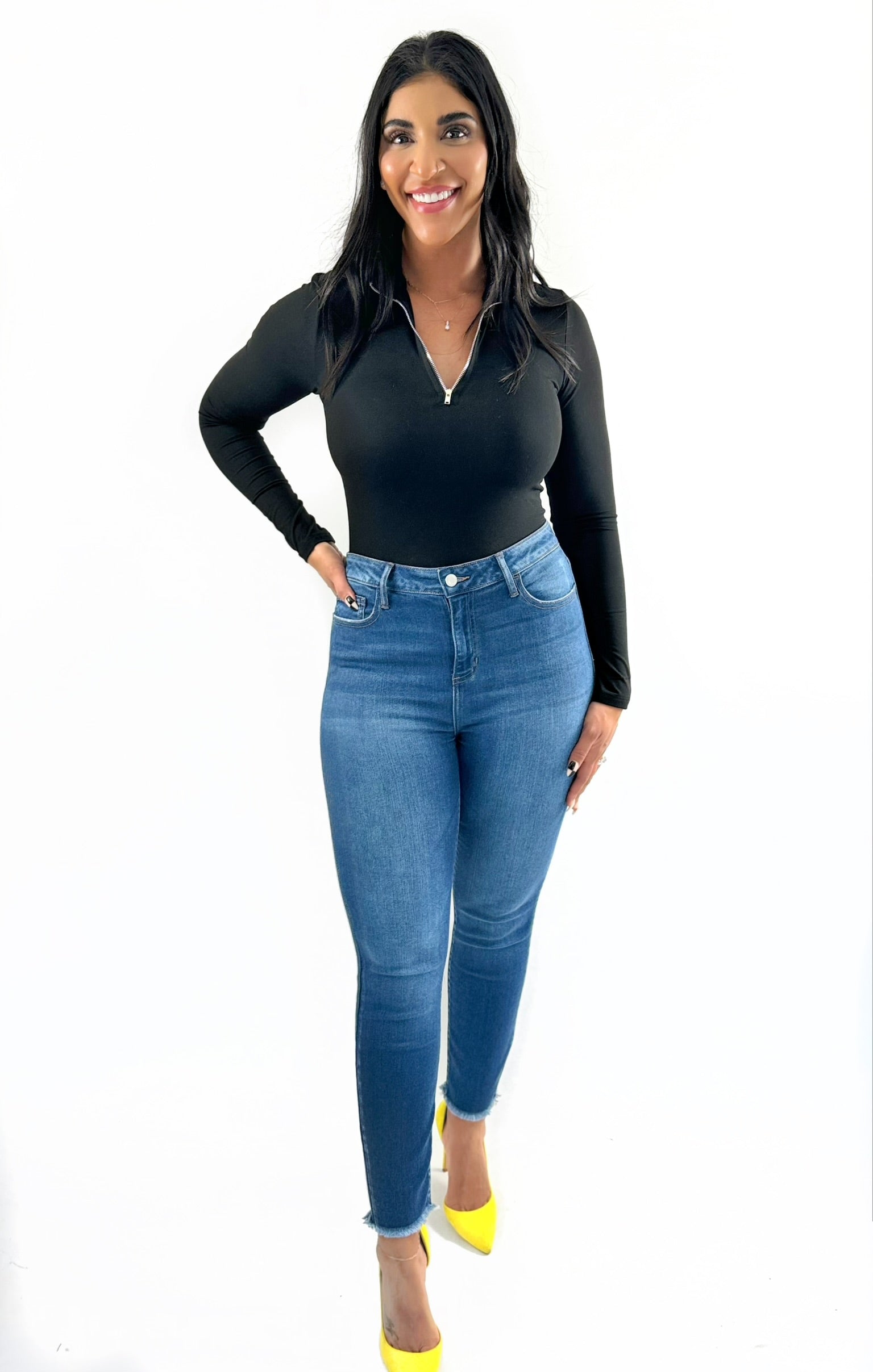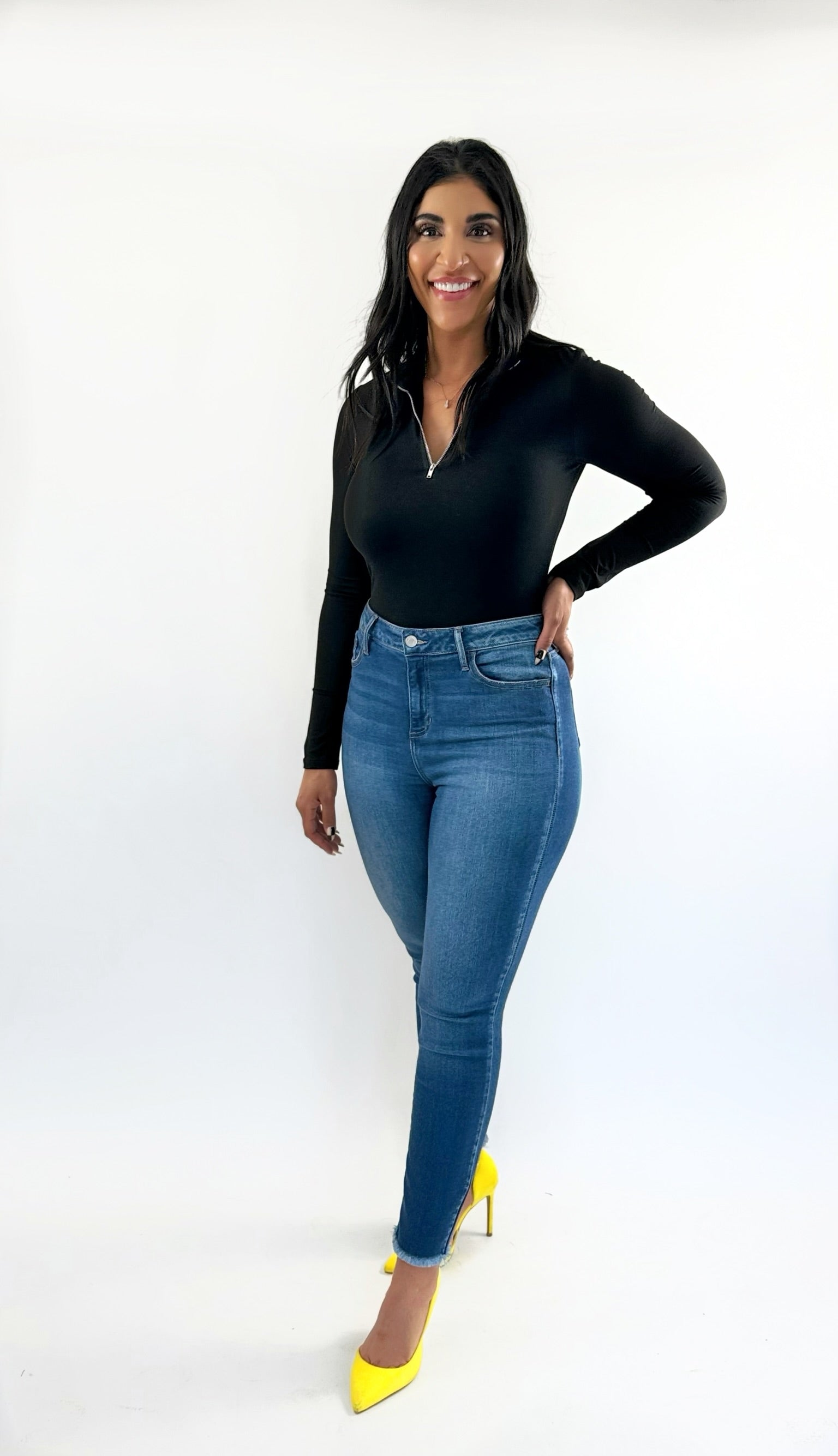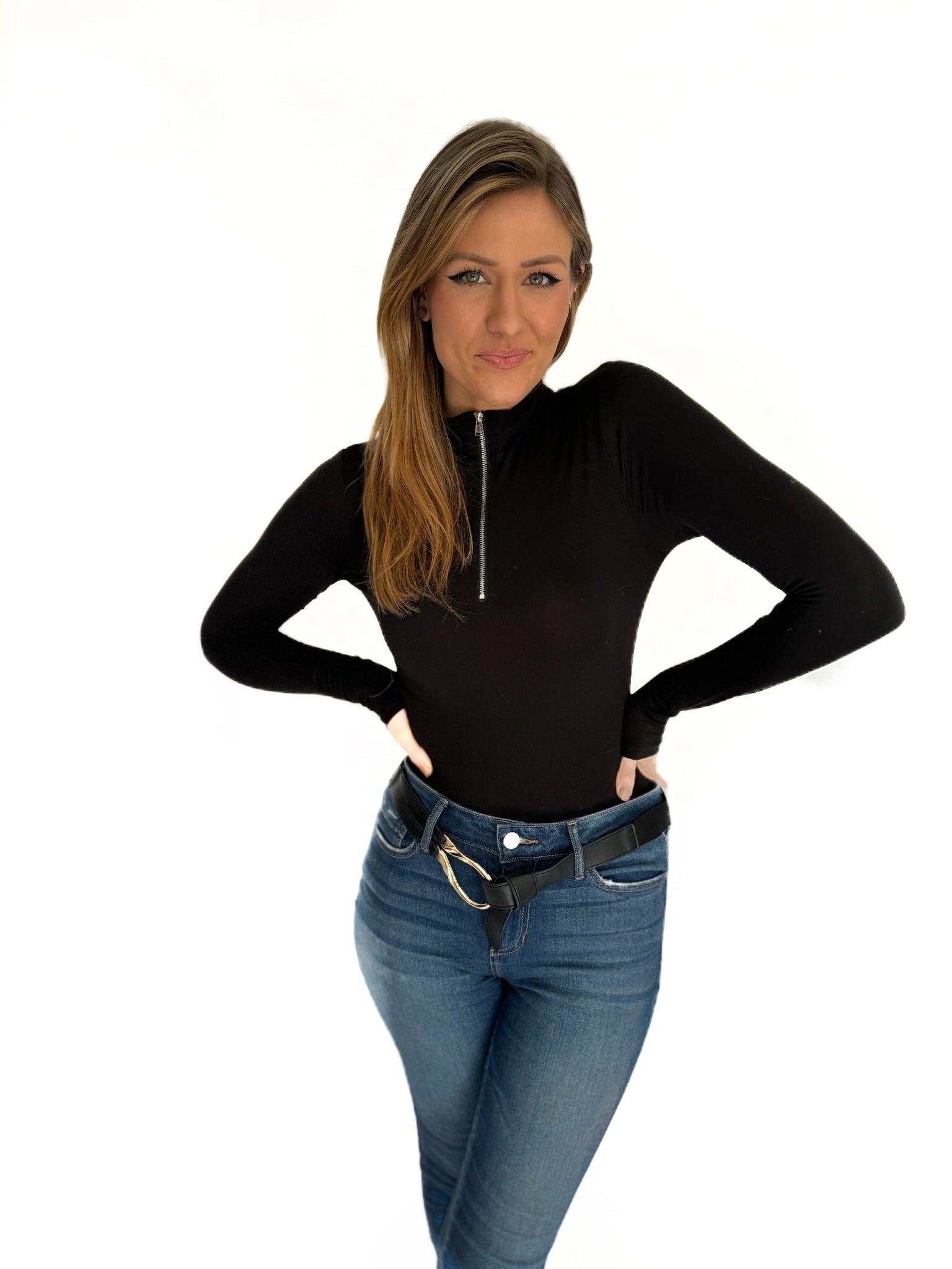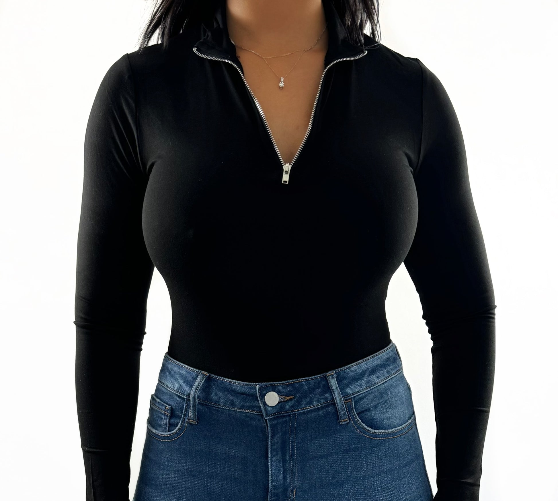 Mimiti Bodysuit features a fitted black bodysuit with long sleeves and a convenient front zipper closure. Its slim silhouette offers a modern and comfortable fit that’s meant to flatter. The superior construction of this bodysuit is designed to provide you with long-lasting quality.