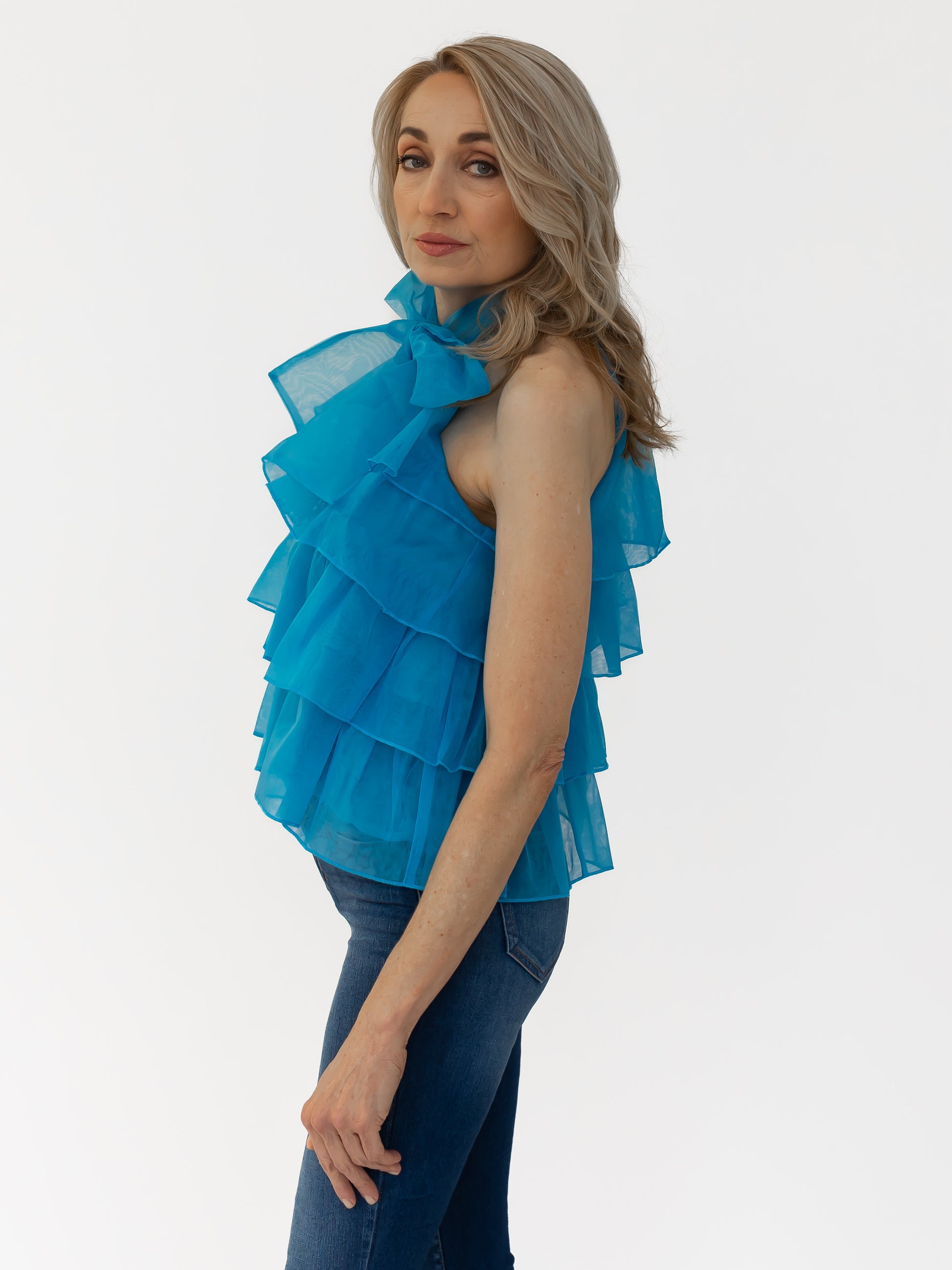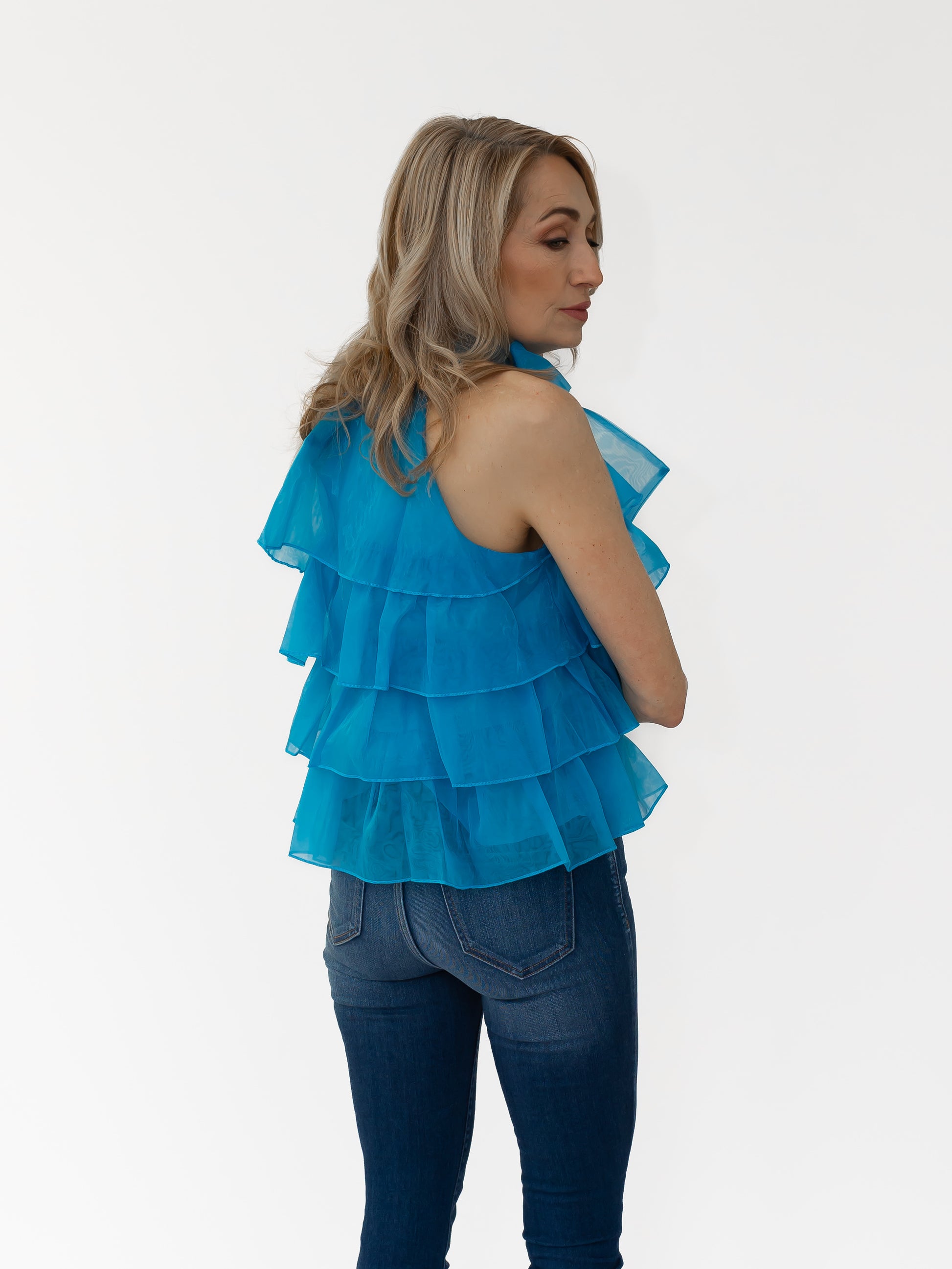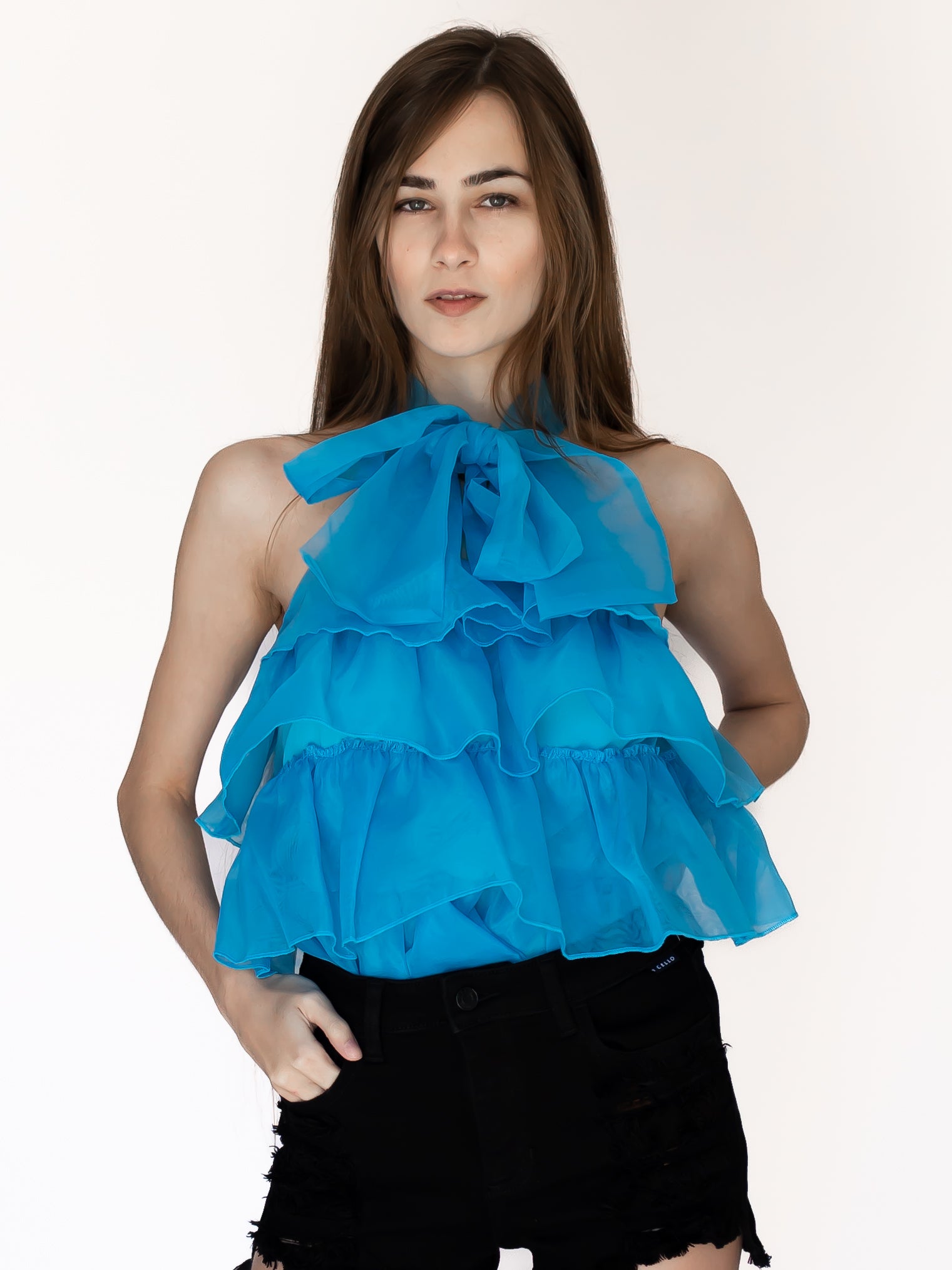 Strut your stuff in this daring blue neck-tie puff top! Show off your unique sense of fashion with this eye-catching piece.