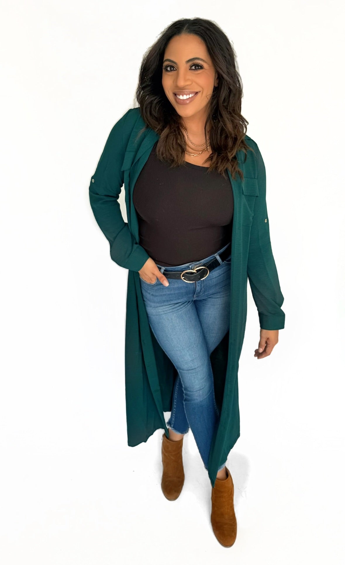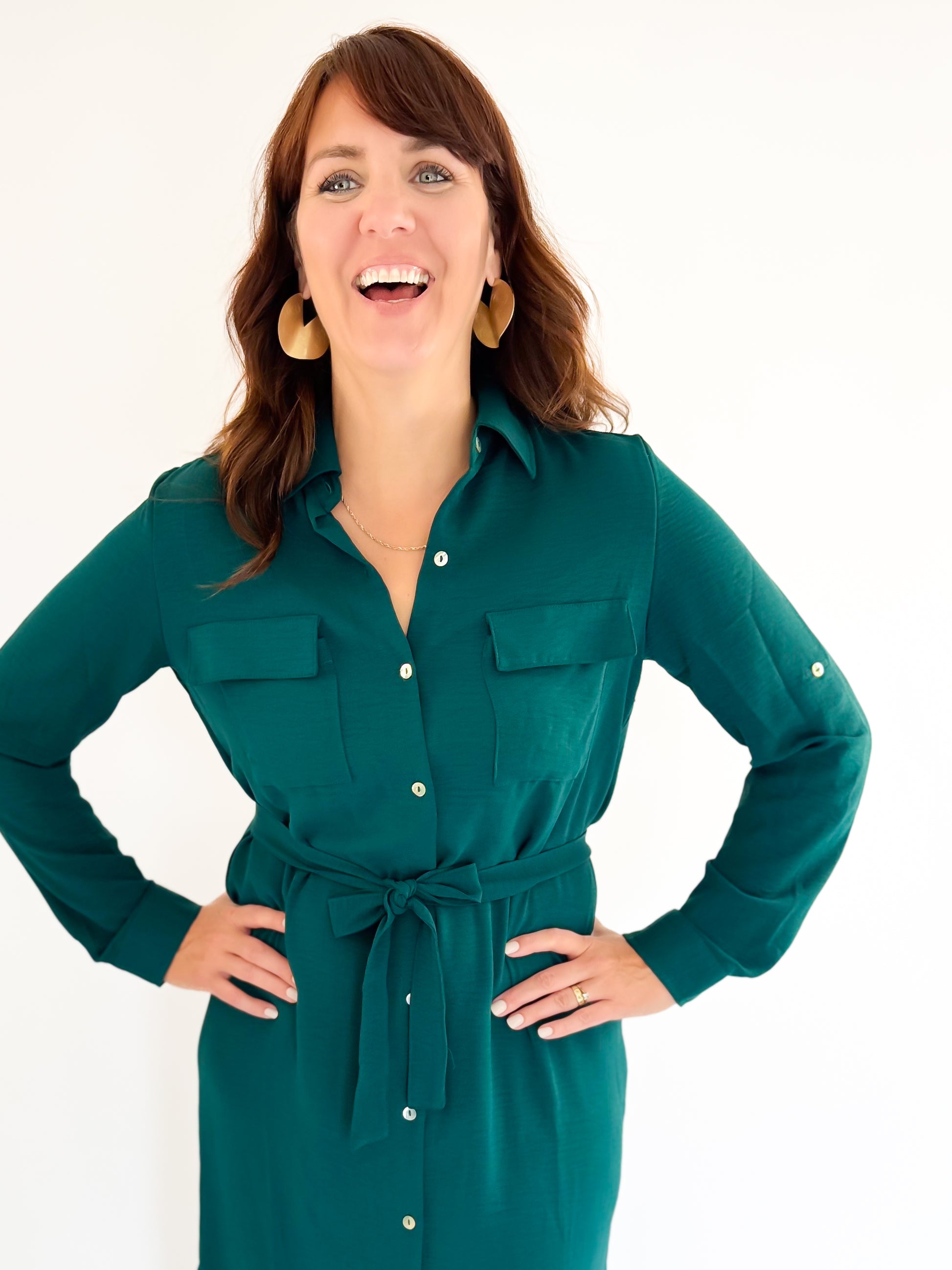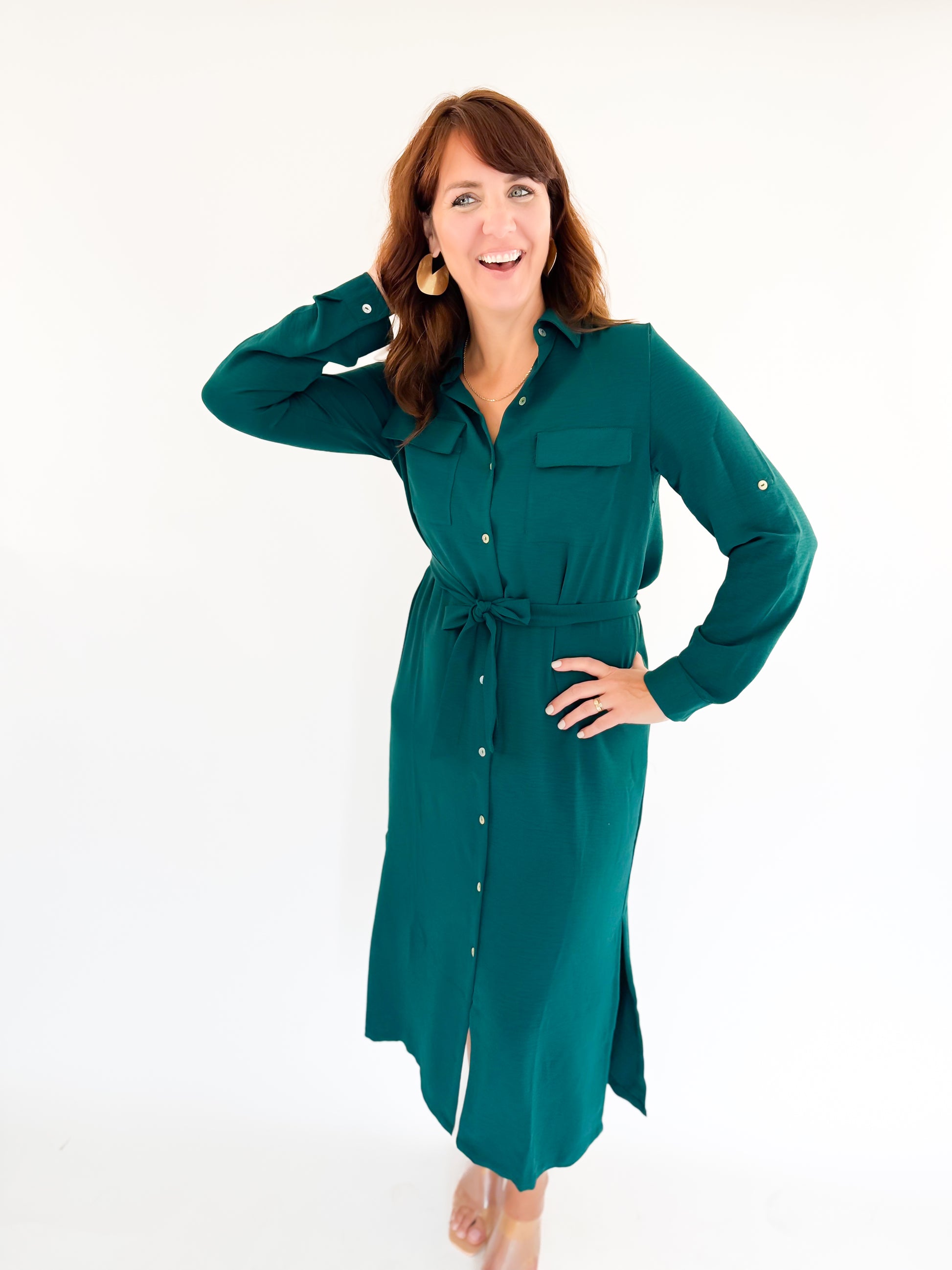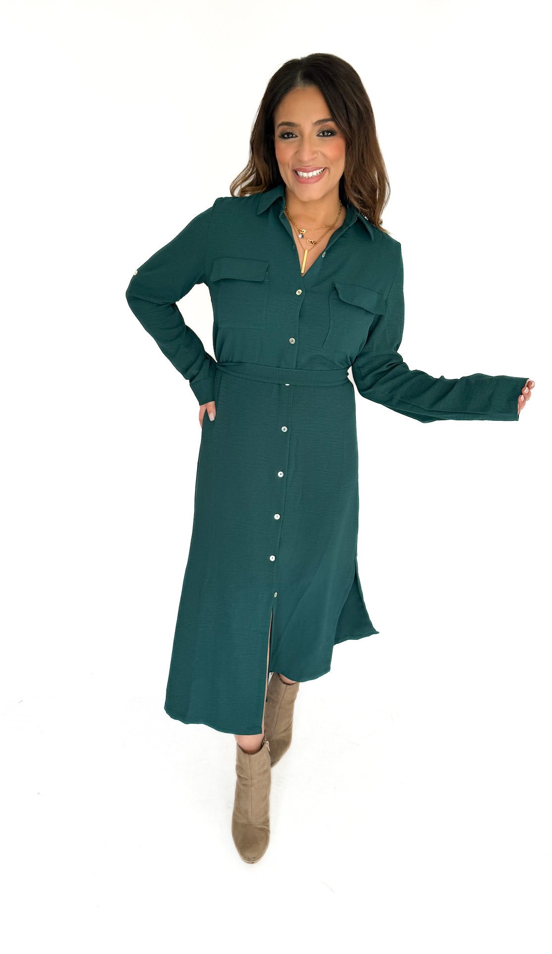 The Shelly Dress offers a timeless blend of sophistication and elegance. Constructed from a vibrant green long button down fabric, the dress provides a stunning look ideal for both special occasions and everyday attire. Further enhanced by a classic belt for a tailored silhouette, it can also be worn open like a light jacket.