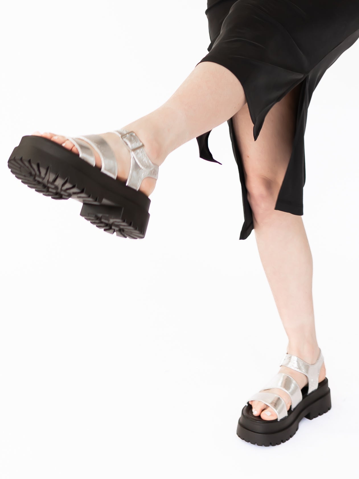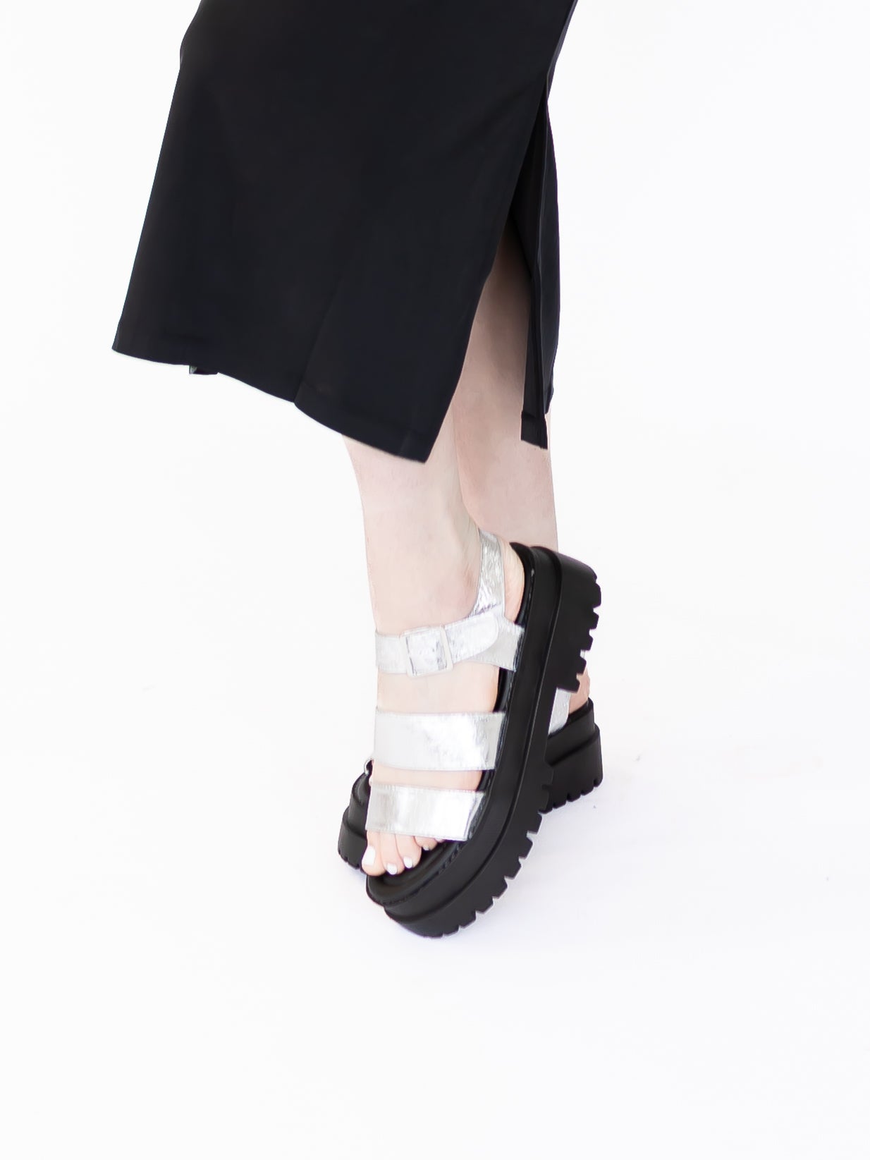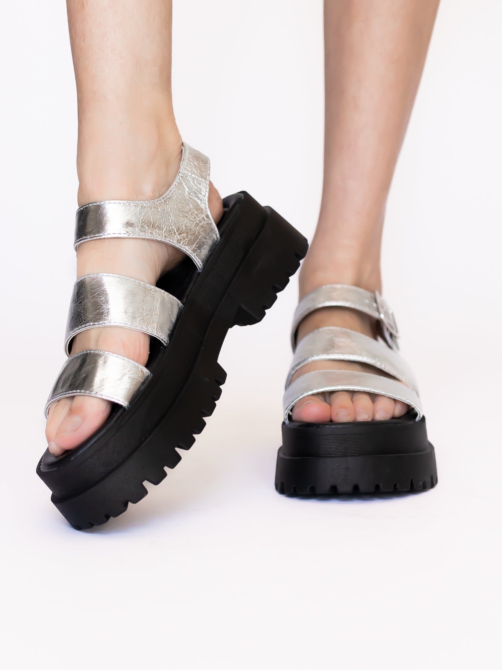 Go around town with flair wearing the chunky, featherweight metallic tie-up flat sandal in shimmering silver!