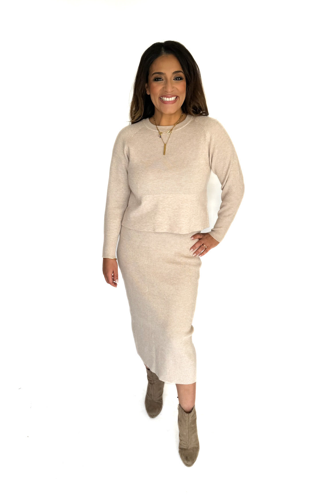Stay comfy and stylish all day in this Sisi Set. This knitted skirt set features soft, high quality material and a modern khaki color that will easily match any wardrobe. Perfect for daily wear!