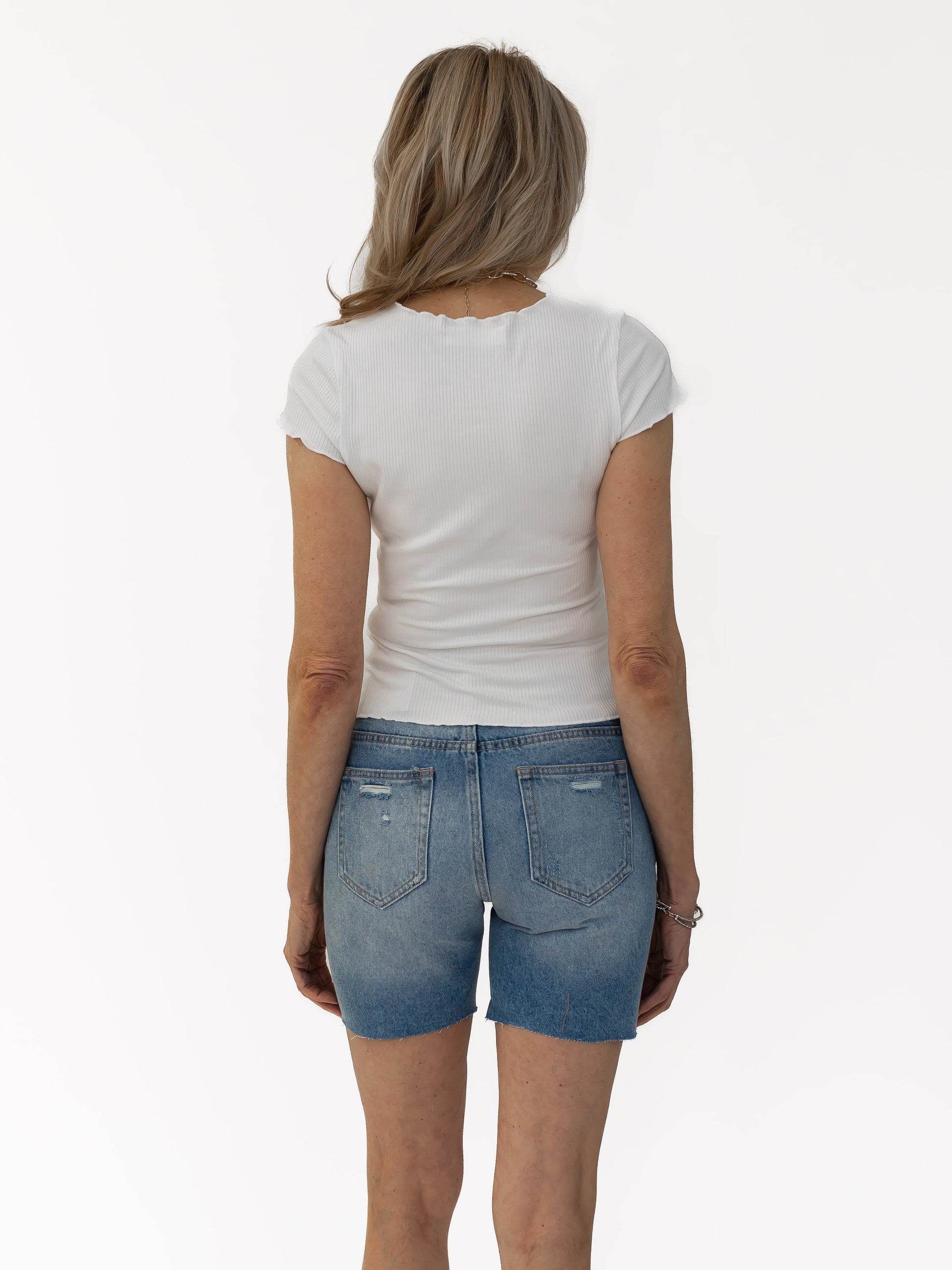 Crafted with a ribbed construction and boasting a classic short-sleeved, V-neck silhouette, this off-white top is a stylish addition to any wardrobe.