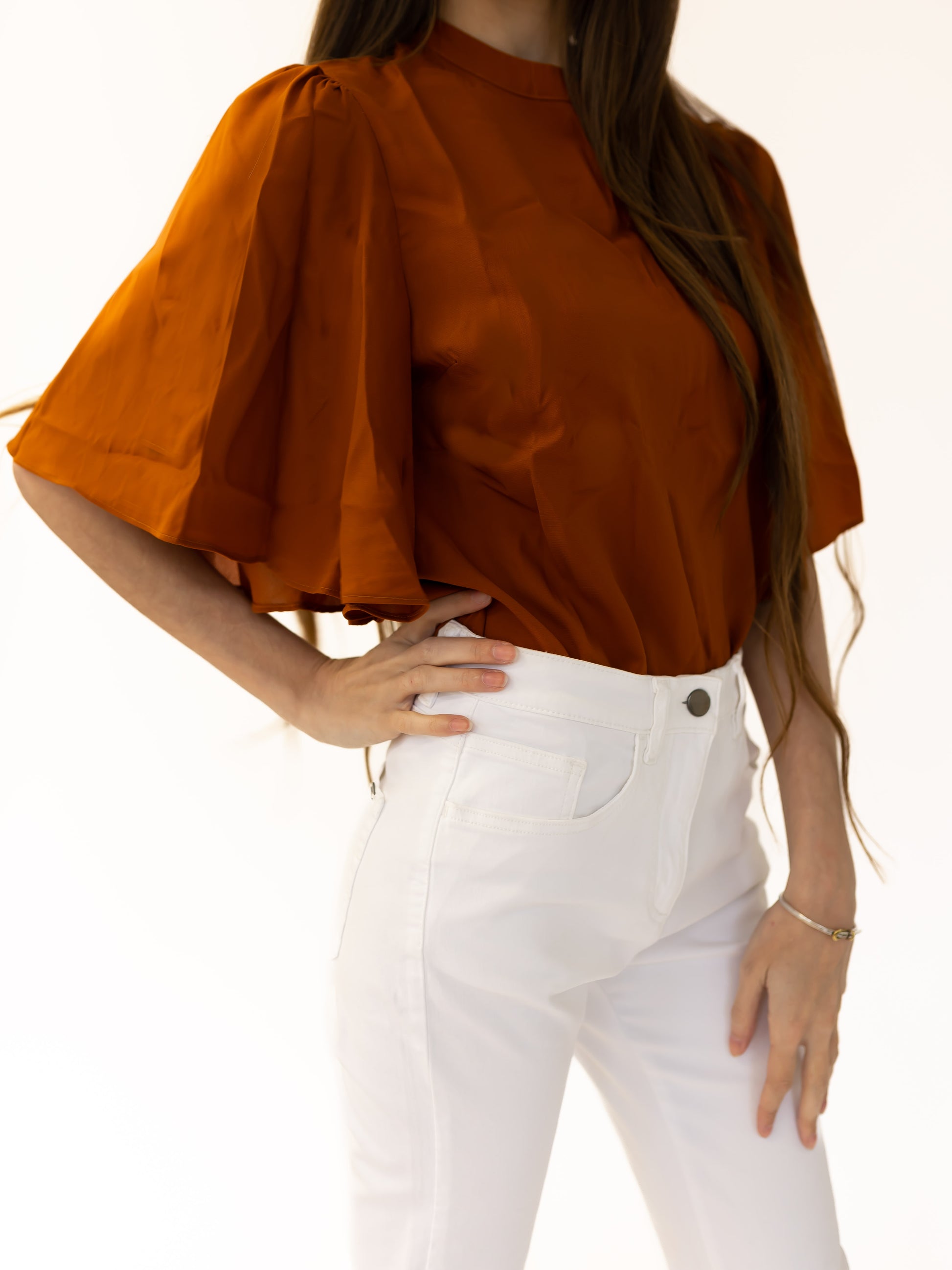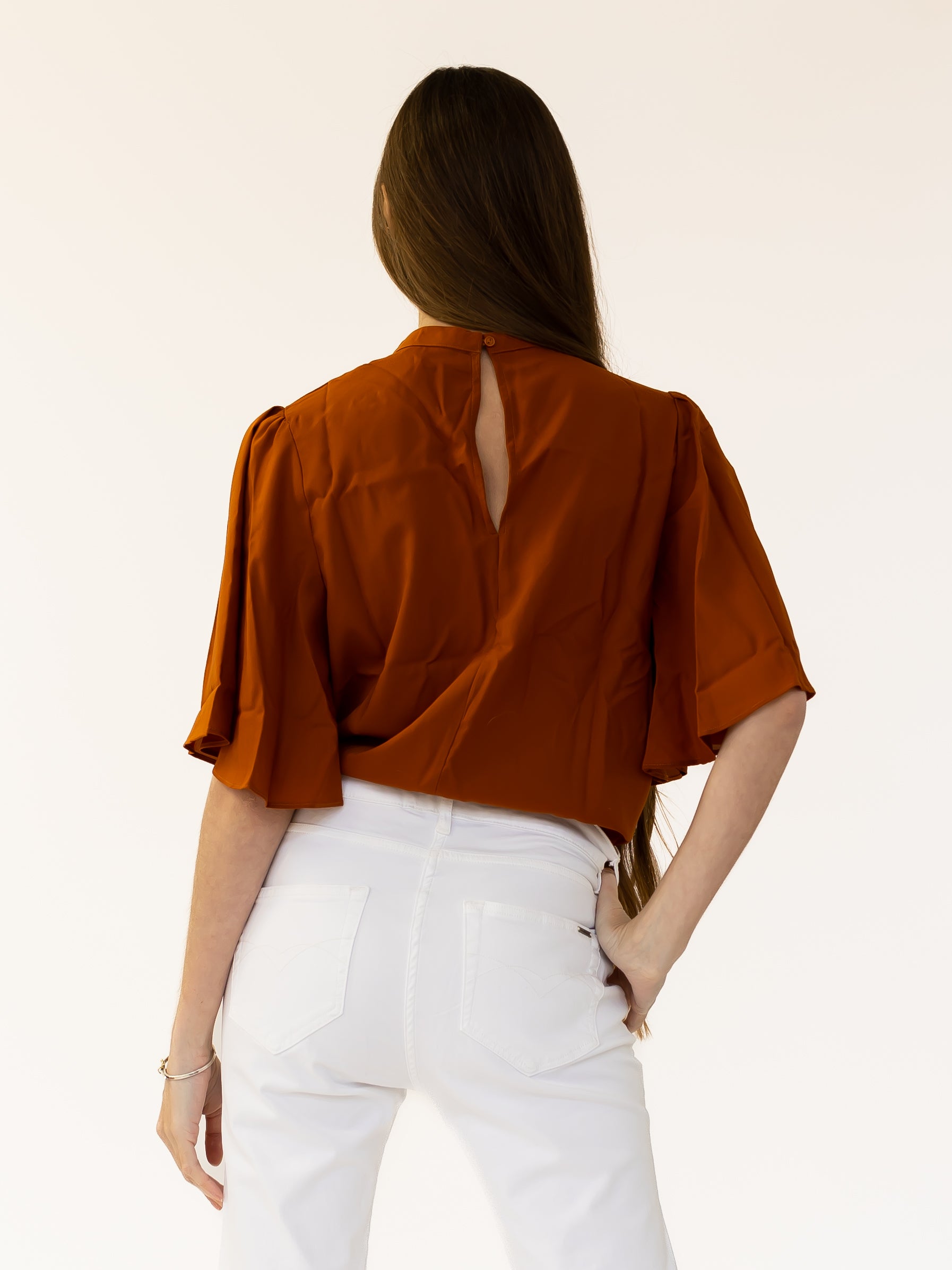 This sophisticated, office-ready blouse features delicate butterfly sleeves in a sumptuous brown hue.